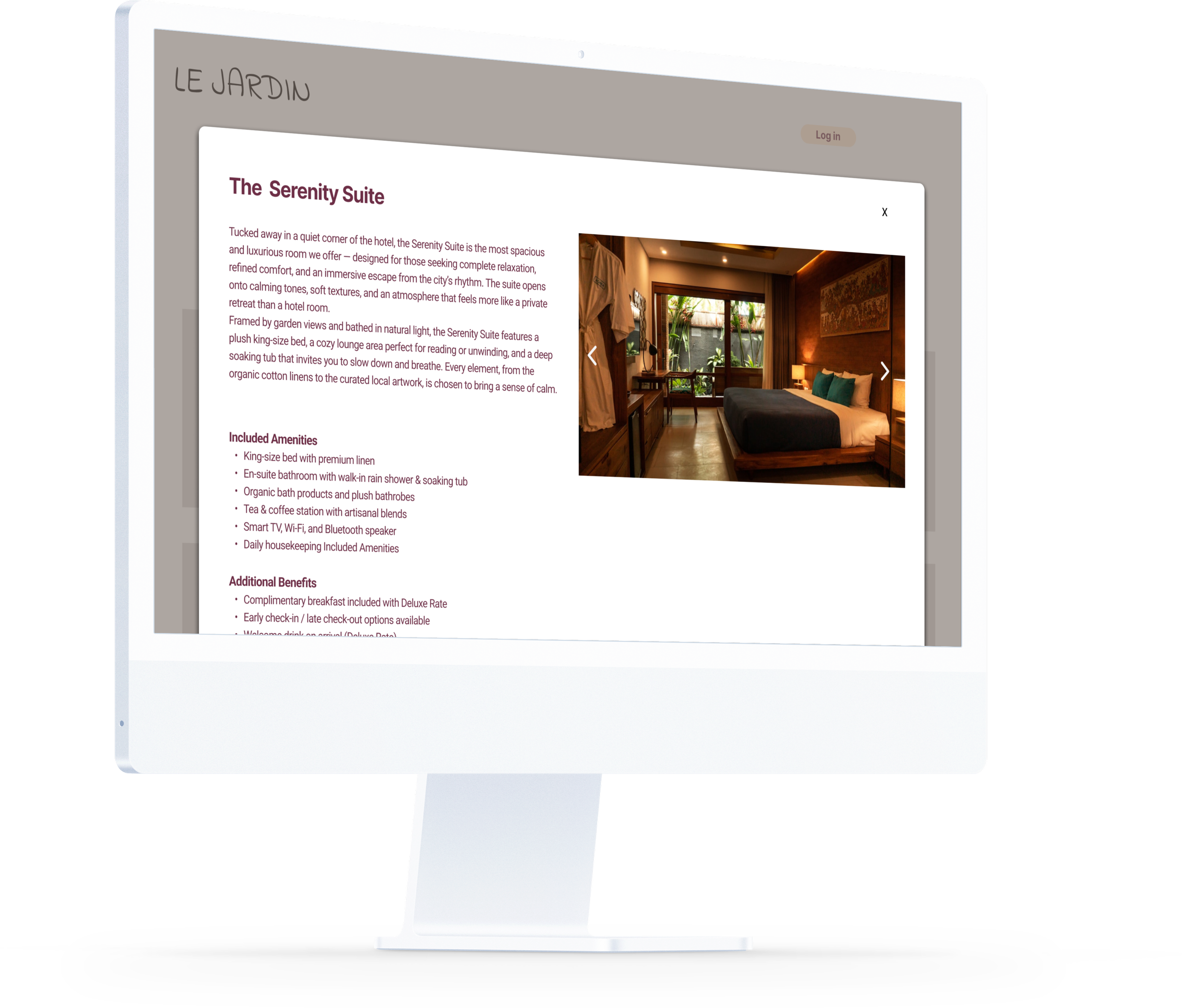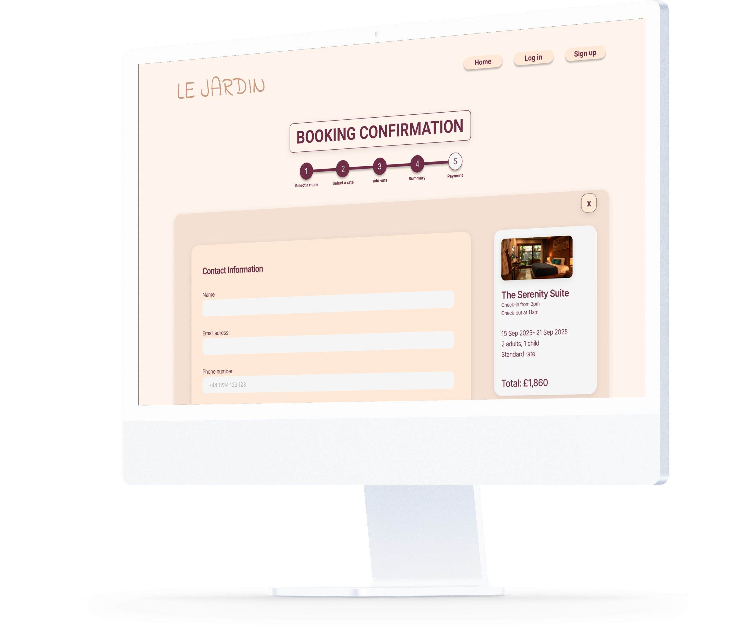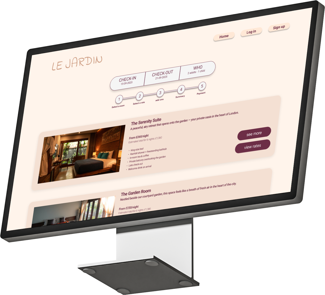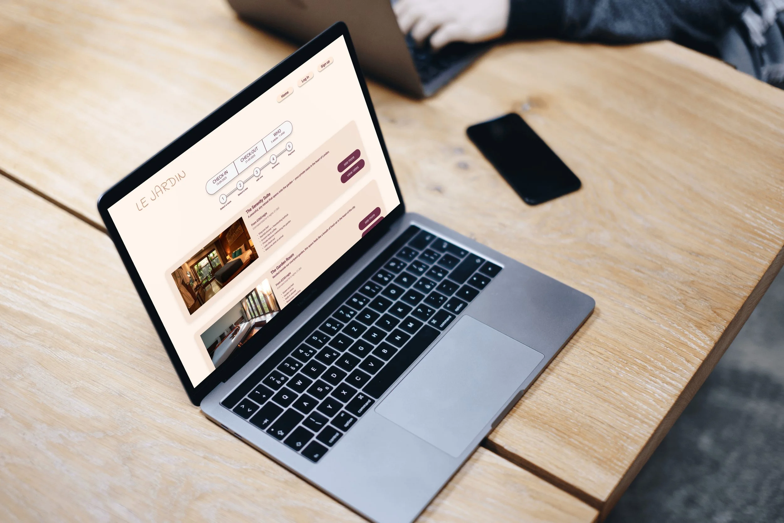 The aim of this project was to design a responsive website for Le Jardin, a fictional boutique hotel nestled in the heart of Shoreditch, London. The hotel offers a peaceful, nature-inspired retreat from the city buzz, blending Moroccan riad aesthetics with modern simplicity. The goal was to create a seamless and intuitive booking experience that reflects the calm, relaxing atmosphere of the hotel.